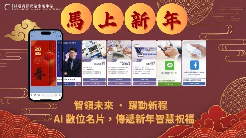 新年,就從最有「科技感」的祝福開始。 隨著 2026 馬年的到來,誠翊資訊 為您的 AI 數位名片 注入全新的節慶動力!我們提供種不同風格、圖像排版的設計賀卡,讓您的商務祝福在眾多訊息中脫穎而出。 💻即時專業:一鍵切換節慶封面,展現企業與時俱進的專業形象。 📲智聯互動:不僅是名片,更是傳遞溫度的科技連結。 🙋專人服務:你只需挑選心儀款式,繁瑣的上傳設定由我們為您代勞。 活動三步驟📍: 📲線上瀏覽:檢視我們精心設計的多款「新年賀卡」。 💌告知款式:選定您最喜歡的設計編號。 👌LINE 告知:直接透過 誠翊資訊官方 LINE 告知您的選擇。 剩下的,就交給誠翊專業團隊! 我們將主動協助您完成賀卡上傳設定,讓您的 AI 數位名片瞬間煥然一新,開啟躍動的新年商機。 未來已來,讓 AI 賀卡引領您的新年祝福。 立即挑選您的專屬馬年封面,展現智領未來的領袖風範! AI數位名片賀卡使用範例: 賀卡會顯示於您的 AI 數位名片第一張,後方仍依序呈現您的名片資訊,不影響原有內容。訪客開啟名片時會先看到賀卡,往下滑即可查看您的聯絡方式與名片資訊!